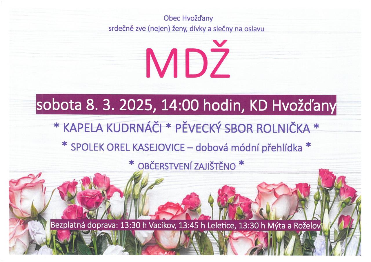 Obec Hvožďany srdečně zve na MDŽ dne 8. 3. 2025 v 14 : 00 v Kulturním domě Hvožďany.