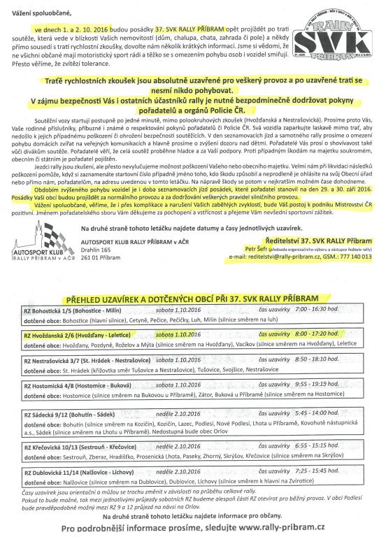 V sobotu 1. 10. 2016 bude probíhat rychlostní zkouška Rally Příbram přes obce Hvožďany,Pozdyně a Leletice. Závodem budou okrajově dotčené i obce Roželov a Vacíkov.Trať rychlostní zkoušky je absolutně uzavřená pro veškerý provoz a po uzavřené trati se nesmí nikdo pohybovat. Silnice budou uzavřeny od 8:00 do 17:20 hodin. V zájmu bezpečnosti je nutné bezpodmínečně dodržovat pokyny pořadatelů a orgánů Policie.