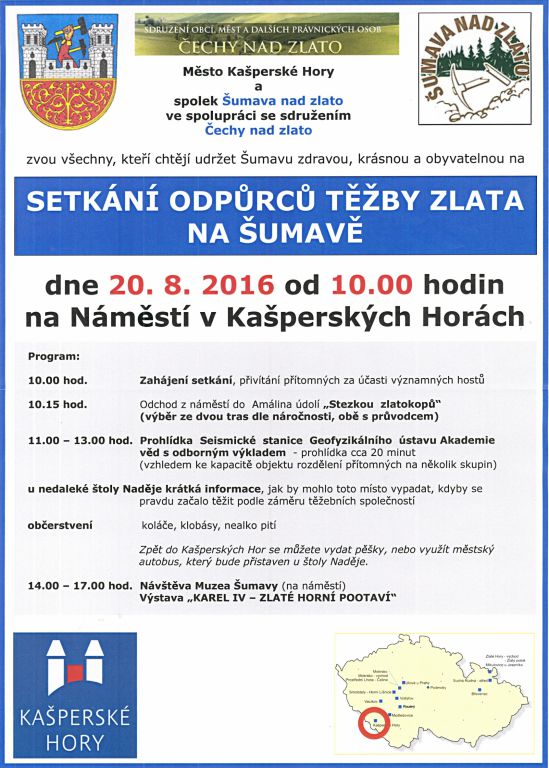 Sdružení Čechy nad zlato zajišťuje pro zájemce bezplatnou autobusovou dopravu do Kašperských Hor na "SETKÁNÍ ODPŮRCŮ TĚŽBY ZLATA NA ŠUMAVĚ", které se koná v sobotu 20. 8. 2016.