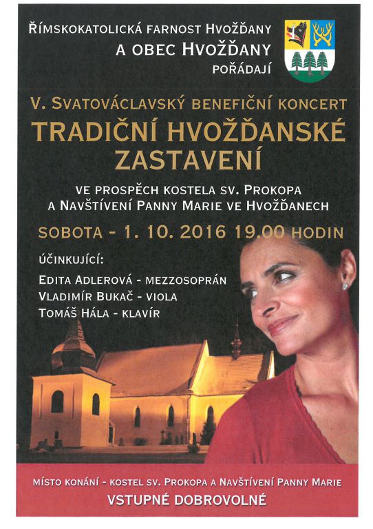 V. Svatováclavský benefiční koncet ve prospěch kostela sv. Prokopa a Navštívení panny Marie ve Hvožďanech. Benefiční vystoupení se uskuteční v sobotu 1. 10. 206 od 19:00 hodin. Účinkující: Edita Adlerová - mezzosoprán, Vladimír Bukač -viola, Tomáš Hála - klavír.